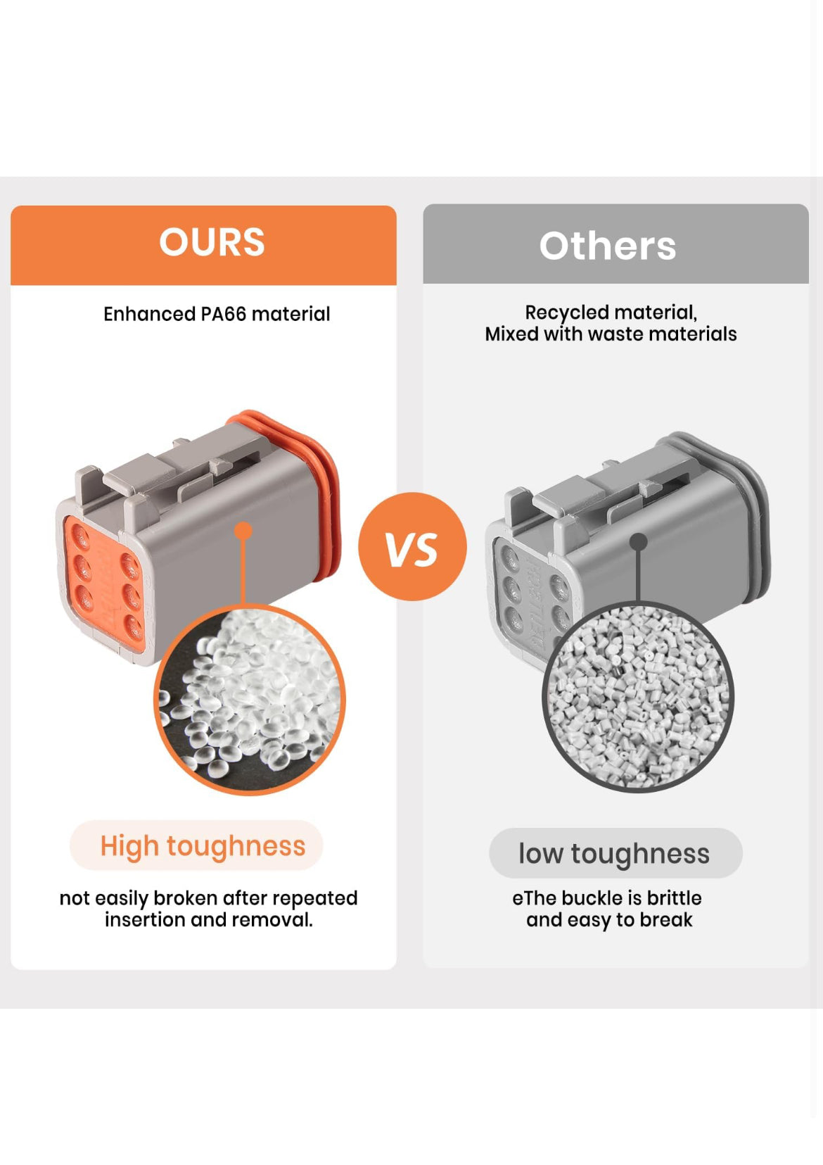 - HIGH-QUALITY CONNECTORS: DT connectors are made from flame-retardant nylon (PA66) and are waterproof, dustproof, and corrosion-resistant, effectively protecting electrical connections from dust, moisture, salt spray, and vibration, making them ideal for demanding environments.